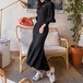 【Vネックフレアワンピース】マキシ丈 ロングスモッグワンピース シック ビッグシルエット 洗練コーデ
