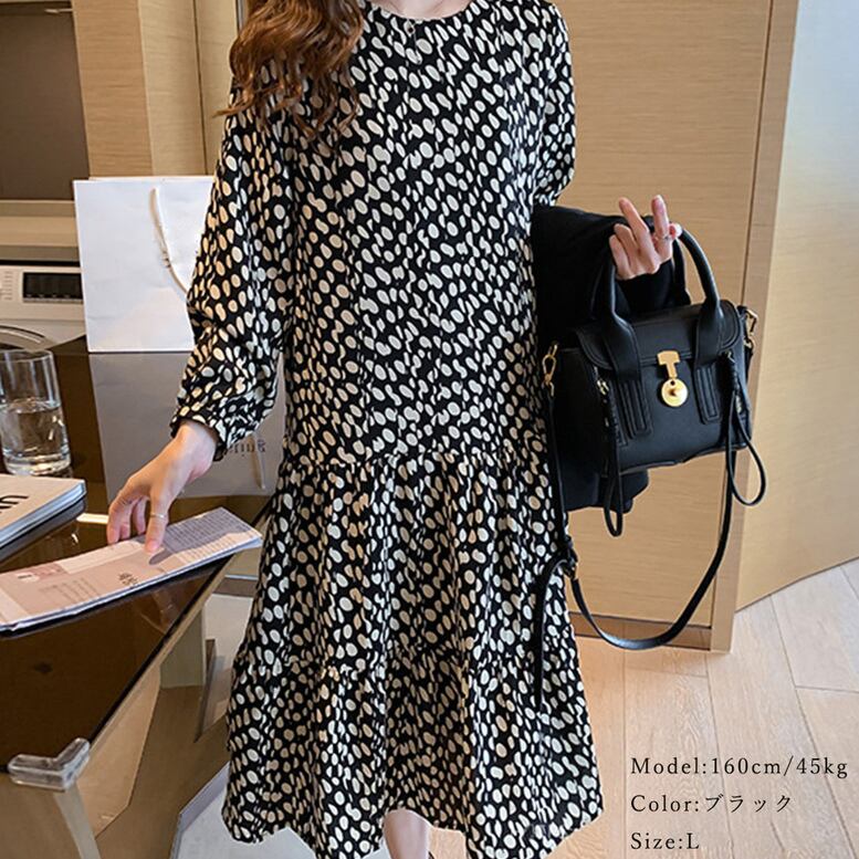 楕円形のドット柄が大人可愛いワンピース ボディラインを拾わずリラックスしながら清楚な雰囲気をキープします 1枚で着るのはもちろん羽織りものやレギンスなどとレイヤードするのもおすすめ ■商品コード W220117 ■カラー ブラック ■サイズ(cm) M 総丈:100 肩幅:34 袖丈:52 身幅:49 胸囲:98 ウエスト:98 ヒップ:100 L 総丈:101 肩幅:34 袖丈:53 身幅:50 胸囲:100 ウエスト:100 ヒップ:102 XL 総丈:102 肩幅:34 袖丈:54 身幅:51 胸囲:102 ウエスト:102 ヒップ:104 〇裏地:なし 〇モデル 160㎝ 45㎏ 着用サイズL 〇サイズは採寸方法により1-3㎝ほど誤差がある場合がございます。 ■素材 ポリエステル100% ■送料 15,000円以上のご購入で送料無料とさせていただきます ■商品発送について ご注文後に商品を確保し検品発送いたします。 在庫切れの際はご連絡させていただきます。 【商品に関する注意点】 ・お手持ちのパソコンやスマホ機器の違い及び写真撮影環境により商品の色の見え方に差が生じる場合がございます。 ・サイズは買付け先の生産表記ですが測り方により1-3㎝ほど誤差がある場合がございます。 ・お客様都合によるキャンセル・返品は承っておりません。サイズ等ご確認の上ご注文下さい。 ・簡易包装にてお送りしております。予めご了承ください。 -------------------------------------------------- ご購入の前に必ずショップ情報をご確認くださいませ https://graces.fashionstore.jp/about --------------------------------------------------