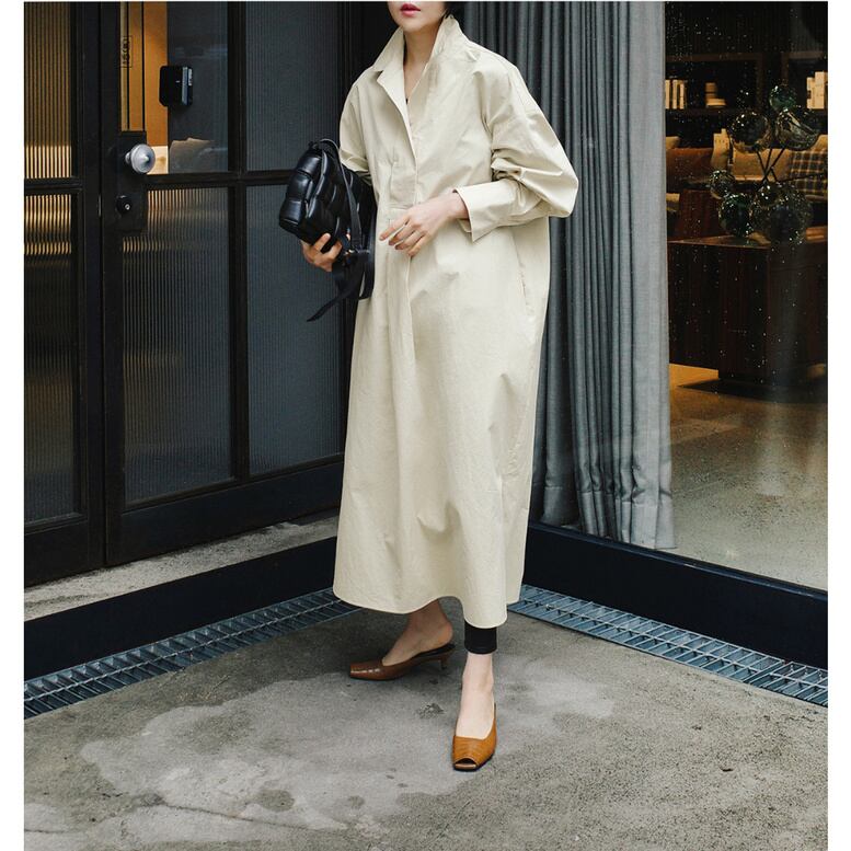 【Vネックフレアワンピース】マキシ丈 ロングスモッグワンピース シック ビッグシルエット 洗練コーデ